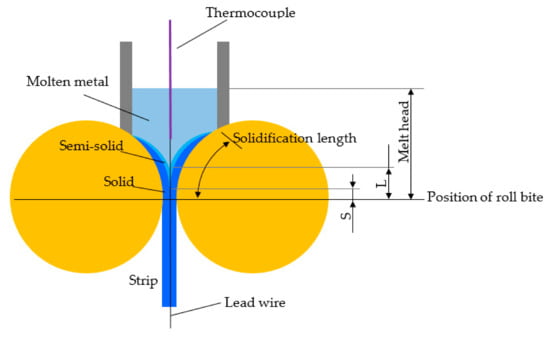 When the free solidified surface of the overlay strip contacts the base strip, the free solidified surface temperature is the liquidus line. The latent heat of the semisolid metal in the overlay strip heats the base strip and bonding occurs. The latent heat is usually larger than the specific heat. The base strip is heated by the latent heat. The results shown in Figure 12 support this. The bonding time for the strips was estimated from measurement of the metal temperature between the rolls using a thermocouple. The experimental method is shown in Figure 19. A thermocouple with a 0.1 mm diameter was dragged by a lead wire into the melt pool and embedded in a strip of the 4045 alloy. The positions of the liquidus line and solidus line were 40 mm and 5 mm from the roll bite, respectively. It took 0.07 s to travel from the liquidus line point to the solidus line point when the roll speed was 30 m/min. Bonding between the base strip and the overlay strip occurred only within this 0.07 s timeframe. Thus, the bonding between strips was estimated to occur over a very short time.