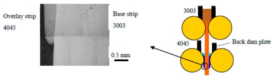 Figure 20 shows the contact-start point between the base strip of the 3003 alloy and the overlay strip of the 4045 alloy. The overlay strip was immediately bonded to the base strip after pouring the molten metal of the overlay strip []. The transition length of the overlay strip depended on the time it took for the melt head of the overlay strip to reach the position of the back dam plate contacting the roll.