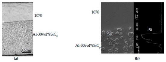 Cross-section of clad strip consisting of a 1070 base strip and an Al-30vol%SiCp overlay strip, and the result of a line analysis of Si at the interface between strips. (a) Cross-section of clad strip. (b) Line analysis of Si.