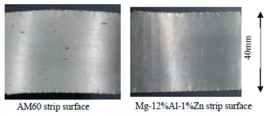 Hot rolling of a clad strip consisting of an AM60 alloy strip and Mg-12%Al-1%Zn alloy strip was conducted by the cold-roll method (room temperature). The clad strip was heated, while the rolls were not heated. The clad strip was not peeled off at the interface by the hot rolling. The surfaces of the clad strip after hot rolling are shown in Figure 25. No cracks occurred at the surfaces without edges.