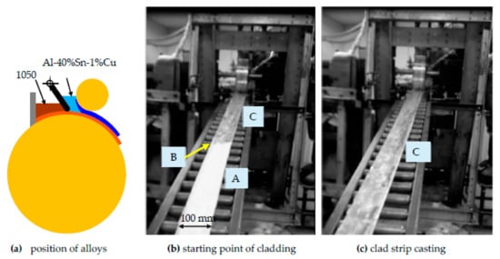 Casting of clad strip consisting of 1050 and Al-40%Sn-1%Cu. (a) Position of alloys, (b) starting point of cladding, (c) clad strip casting. A: 1050 base strip only, B: starting point of cladding, C: clad strip of 1050 and Al-40%Sn-1%Cu.