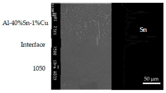 The temperature of the Al-40%Sn-1%Cu alloy overlay strip of the clad strip was about 550 °C when it released from the upper roll. It took more than 5 min for the temperature of the Al-40%Sn-1%Cu alloy overlay strip to become lower than the solidus line of 228 °C, so that the Al-40%Sn-1%Cu overlay strip was in a semisolid condition for more than 5 min. Figure 27 shows the results of a line analysis for Sn at the interface between the 1050 base strip and the Al-40%Sn-1%Cu alloy overlay strip. Sn, which was an element of the Al-40%Sn-1%Cu alloy overlay strip, did not diffuse into the 1050 base strip. The scribed surface of the 1050 base strip was semisolid with a high solid fraction when the molten metal of the Al-40%Sn-1%Cu alloy started contacting the 1050 base strip, and the Al-40%Sn-1%Cu alloy overlay strip was semisolid for more than 5 min. In spite of these conditions, diffusion of Sn did not occur.