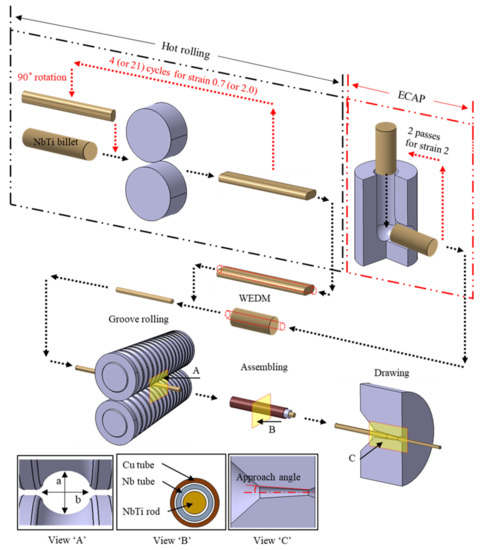 Figure 1 shows the overall process concept for making the superconducting NbTi monowire from the initial NbTi billet. For ease of comparison, the ECAP process used in our previous study is shown together [16]. In ECAP, if the specimen is pressed after being inserted into the top inlet of the ECAP mold, it undergoes a high level of shear deformation by passing through a channel with a 90° bending angle [18,19,20,21,22,23,24,25]. The diameter of the billet was not changed after this process. The ECAP mold was designed to apply strain of 1.0 per pass. Therefore, in this paper, the results of an ECAPed specimen subjected to 2 passes (strain 2.0) were compared with the results of the hot rolled specimen.