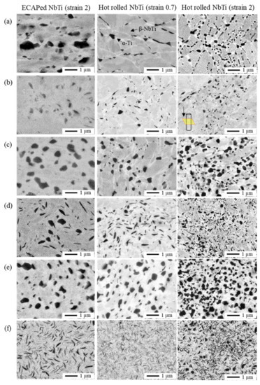 Figure 11a shows the schematics of the β-NbTi microstructures before and after the first heat treatment. As described in Section 3.3, when hot rolling was performed to induce a strain of 2.0, grain refinement occurred relatively uniformly. However, in the case of the ECAPed specimen with a strain of 2.0, refined and non-refined grains exist simultaneously. This difference is considered to have a great influence on the precipitation of α-Ti phases after the first heat treatment. As shown in Figure 11a, in the hot rolled specimen with a strain of 2.0, the grain boundary is evenly distributed over the entire area due to static recrystallization after the first heat treatment. This means that the grain boundary and triple point where α-Ti phases can be precipitated are evenly distributed over the whole region. Therefore, α-Ti phases can be precipitated uniformly in the hot rolled specimen. On the other hand, in the case of the ECAPed specimen, a non-homogeneous grain refinement characteristic is maintained after the first heat treatment, as only grain growth without static recrystallization occurred during the first heat treatment. This means that large α-Ti phases can be precipitated near coarse grains, and small α-Ti phases can be precipitated in the vicinity of fine grains, as shown in Figure 11a [34]. Therefore, it is posited that the abnormally large α-Ti phases in Figure 4a were formed by the abovementioned reason.