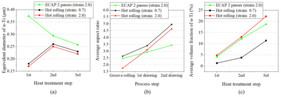 Graphs depicting (a) equivalent diameter of the α-Ti phase after each heat treatment, (b) average aspect ratio of the α-Ti phase after each cold work and (c) average volume fraction of the α-Ti phase after each heat treatment. Results of the ECAPed specimen with a strain of 2.0 and the hot rolled specimen with a strain of 0.7 are reused from references [16] and [17], respectively.