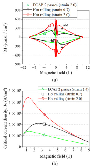 Figure 7a shows the normalized moment values of the NbTi monowire after the second drawing. The moment value measured between the magnetic field (−0.5 T)–(+0.5 T) is unstable. Therefore, the data from 0 T to 0.5 T were excluded from the critical current density calculation. The critical current density of the wire-shaped specimen is obtained by substituting the ΔM of Figure 7a into Equation (2), and the results are presented in Figure 7b. In all cases, critical current density increased and reached a peak point as the magnetic field decreased. After passing its peak point, critical current density continued to decrease. The specimen subjected to hot rolling with a strain of 2.0 showed the highest critical current density in the whole magnetic field range, and the maximum value was measured at around 1.2 T. Particularly, this maximum value of the critical current density was 3.2 times larger than that of the ECAPed specimen. The ECAPed specimen showed the lowest critical current density. This is considered to be due to a relatively large equivalent diameter and a low aspect ratio of the α-Ti phases compared to the hot rolled specimens. Additionally, the number of α-Ti phases folded like a ribbon shape appears to be less compared to the hot rolled specimens.