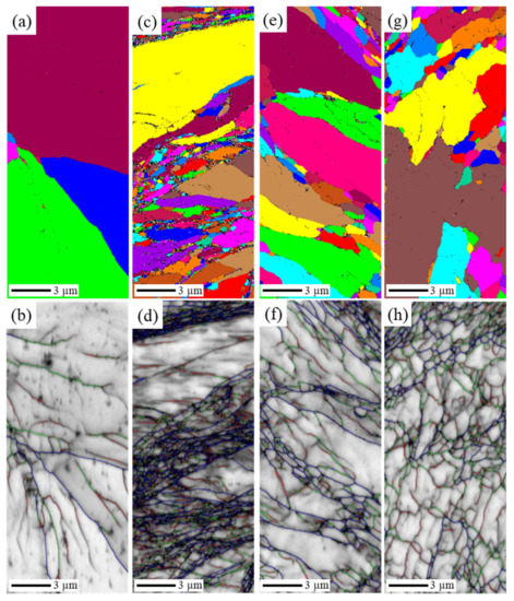 Figure 8 shows the grain distributions before the first heat treatment, according to the initial process conditions. As shown in Figure 8a,b, the as-received specimen has coarse β-NbTi grains. When ECAP is performed twice to induce a strain of 2.0, a grain refinement partially occurs (Figure 8c,d). In contrast, relatively uniform grain refinement occurs in the hot rolled specimens with the strains of 0.7 and 2.0 (Figure 8e–h). This difference is more pronounced after the first heat treatment.