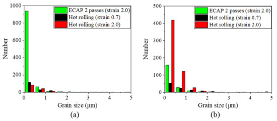 Figure 4b shows that some of the spherical α-Ti phases are partially flattened due to compressive deformation during the first groove rolling. However, it seems that they did not receive sufficient deformation (or compressive stress) to change all spherical α-Ti phases to flat α-Ti phases. Subsequently, as the second heat treatment proceeds, the partially flattened α-Ti phases disappear, and all α-Ti phases change to a spherical shape (Figure 4c). This is because the intermediate heat treatments spheroidized the flat α-Ti phases and also precipitated new α-Ti phases at grain boundaries and triple junctions [30]. The peculiar thing is that, in the case of ECAPed specimen, the size of α-Ti phases after the second heat treatment is smaller compared to the first heat treatment step, whereas the size of α-Ti phases in the hot rolled specimen after the second heat treatment seems to have increased compared to the first heat treatment. It is believed that this is because the abnormally large α-Ti phases were precipitated in the ECAPed specimen during the first heat treatment.
