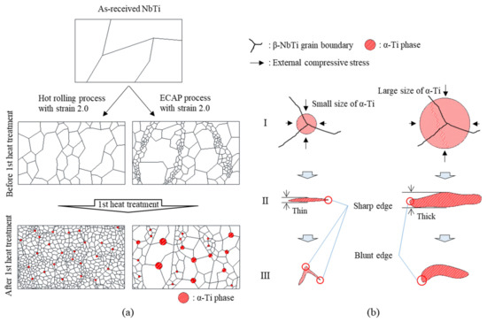 Schematics depicting (a) β-NbTi microstructures according to process sequence and (b) deformation progress of small and large α-Ti phases.