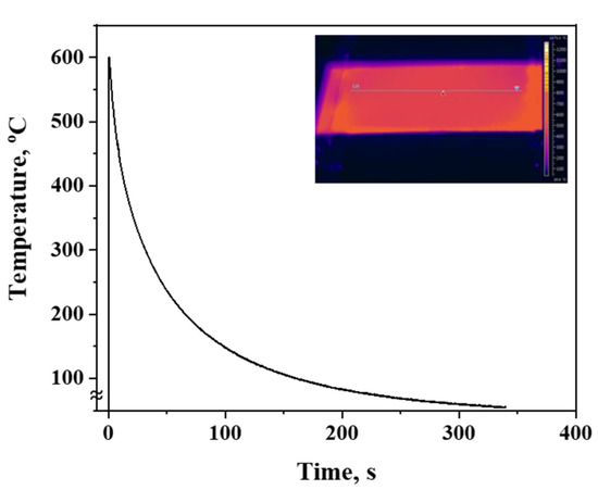 When an electric current is applied to a metallic material, heat is generated through the electrical resistance within a relatively short time. For example, at a current density of 66 A/mm2, the temperature of the electric current-treated specimen rapidly reaches a peak temperature of 600 °C in 0.5 s and decreases to room temperature in 340 s, as shown in Figure 2. In addition, the image captured using an infrared thermal camera revealed that the temperature was uniformly distributed over the entire sample subjected to peak electric current treatment. Similarly, all the samples were successfully current-treated in the target temperature range of 400–700 °C.
