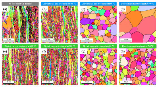 Figure 3e–g show the electric current-treated microstructure of CP Ti sheets at 400, 500 and 600 °C, respectively. Unlike the conventionally heat-treated specimen, the electric current-treated specimen did not show any recrystallization behavior at 400 °C, as shown in Figure 3e. The electric current treatment at 400 °C applied for a short duration (0.5 s) is insufficient for the activation of recrystallization. At 500 °C, recrystallization begins and the area fraction of the recrystallized region is 19.7%, which is similar to that of the specimen conventionally heat-treated at 400 °C. The average grain size of the recrystallized grains is 0.54 μm. At 600 °C, 84.1% of the area shows recrystallization with an average grain size of 5.0 μm. To obtain a fully annealed microstructure by applying an electric current, an additional treatment was conducted with the peak temperature increased to 700 °C. Interestingly, there was no grain coarsening even at a high processing temperature, and the size of the uniformly recrystallized grains was 5.9 μm.
