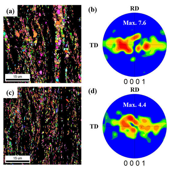 Such a difference between conventional and electric current treatments in terms of the microstructure and texture evolution can be explained by the recrystallization behaviors during post-processing. For a detailed comparison of the early recrystallization behavior between the two cases, the recrystallized grains in the specimen conventionally heat-treated at 400 °C and the electric current-treated sample at 500 °C were selected and the respective microstructure and texture pole figures are shown in Figure 5. Interestingly, the average grain size of the electric current-treated sample (Figure 5c) in the early stages is much smaller than that of the conventionally heat-treated specimen (Figure 5a). The average grain size of electric current and conventional heat treatment specimen was noted as 0.54 μm and 0.94 μm, respectively. In addition, the recrystallized grains in the conventionally heat-treated specimens show texture development in which the basal pole distribution is similar to the as-rolled and overall texture with high intensity.