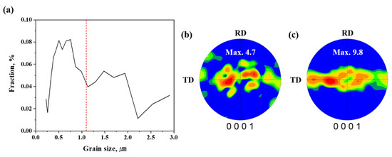 (a) Recrystallized grain size variation in the conventionally heat-treated sample and texture pole figures for (b) smaller grains (<1.1 μm) and (c) larger grains (≥1.1 μm).