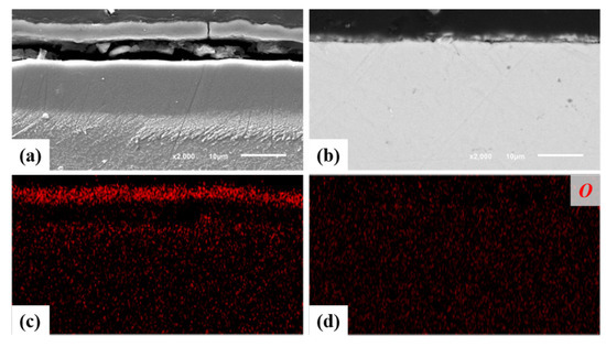 As mentioned previously, the electric current treatment is not only an effective method for saving time and improving the mechanical properties but is also beneficial for preventing oxidation and distortion of thin sheets. Figure 8 shows the overall shape of the sheets after applying conventional heat treatment and electric treatment at 600 °C. The conventionally heat-treated sheet is severely bent, and the oxide layer covers the entire surface. In comparison, the electric current-treated specimen shows a relatively flat configuration with a small change in the color on the surface. For a detailed analysis, a cross-section of the specimens was prepared for microstructural observation, as illustrated in Figure 9. Figure 9a,b show the backscattered electron micrographs of the oxide scales of the thermal and electric treated specimens at 600 °C, respectively. A thick layer of oxide scale (8.5 μm) was formed during heat treatment, which loosened the middle layer of the oxide scale, indicating spallation. In contrast, the oxide scale of the electric current-treated sample was thin, compact and adhered to the base alloy owing to the short duration of the treatment. The oxygen distribution analysis results shown with the EDS mapping (Figure 9c,d) also clearly indicate the difference in the oxide behaviors between the two samples. It can be concluded that the electric current-treated sheet has the advantages of short processing time and enhanced mechanical properties, sheet distortion and oxidation resistance. Thus, the electric current heat treatment method provides a lot of possibilities to control and regulate the amount of supplied energy, thereby the microstructure, mechanical properties and corrosion resistance.