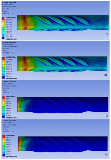Figure 5. Bond shear stress (MPa) measured at the rebar–mortar interface for a displacement equal to 5 × 10−5 mm from a 100-mm-edge cube, where maximum bond shear stress and bond tensile stress (both in MPa) were set to (a) 0.10/0.10; (b) 0.10/1.00; (c) 1.00/0.10; (d) 1.00/1.00.