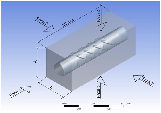 Regarding the thickness of covering, rebars were embedded in mortar prisms with base A × A, where A was changed iteratively: 12, 15, 20, 25, 30, and 50 mm. This assumes effective coverings of 6, 7.5, 12.5, 15, and 25 mm, respectively, which always remain below the minimum values established by codes, as was presented in Section 1. On the other hand, Young’s modulus of hydraulic material that composes prisms surrounding the rebars had values of 5.6, 10, 20, and 50 GPa. Finally, prisms that surround rebars were fixed in their base (face number 1), two lateral faces (face numbers 2 and 3), three lateral faces (face numbers 2, 3, and 4), and four lateral faces (face numbers 2, 3, 4, and 5) iteratively in each analysis (Figure 6).