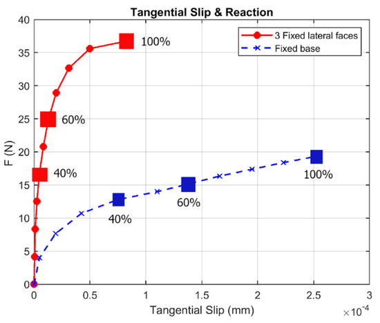 To better understand load transference from rebar to mortar joints, as well as the failure mechanisms of rebars with small diameters thinly covered, an analysis of the slippage failure was carried out. This analysis consisted of augmenting the value of the displacement imposed up to failure of the interface. It was carried out twice. In both analyses, mortar with Young’s modulus of 5.6 MPa and rebar effectively covered with 7.5 mm were set. These samples were analysed when (i) the base (face number 1) was fixed and when (ii) three lateral faces were fixed (face numbers 2, 3, 4). Figure 7 represents the force transferred to the mortar in the function of the longitudinal displacement of the rebar for every load step-up to failure in cases (i) and (ii). The maximum force in (ii) assumes a 90.2% increment with respect to (i). Stress distribution for (i) for 40%, 60%, and 100% of the force transferred from the rebar to the mortar when failure occurs is presented in Figure 8, while Figure 9 depicts similar load steps for (ii).