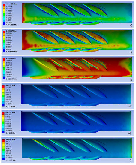 Figure 9a–c depict bonding shear stress distribution when the rebar transferred 40%, 60%, and 100% of the force transferred in failure, respectively, and the rebar was embedded in a mortar prism fixed in three of the four longitudinal faces (faces number 2, 3, and 4). From the beginning of the simulation, these pictures show that the whole rebar contributes to the load transfer mechanism. Figure 9d–f represent bonding normal stress distribution for the load steps previously described. Although only in the last load steps did the ribs work under compression, it is remarkable that all ribs contributed to the force transference mechanism. As a consequence, compressive values were significantly lower than those attained when only the base face (face number 1) was fixed: 1.6459 MPa (Figure 8f) compared to 0.61233 MPa (Figure 9f).