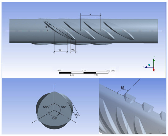 Rib shape is one of the key values regarding bonding in rebars. Various rebar shapes were analyzed in order to check their performance in terms of bonding behavior. Rebar geometry was parameterized as depicted in Figure 10, and the values of the parameters ranged as follows between those recommended in the codes [51,52,53]: (i) central width, Wc, from 1.0 to 3.5 mm; (ii) extreme width, We, from 1.0 to 3.5 mm; (iii) angle between the rib and rebar axes, B, from 35° to 75°; (iv) rib-face angles, Bf, from 45° to 90°; (v) rib height in the central transversal section of the rib, hr, from 0.15 to 0.75 mm; (vi) rib spacing; s, from 3 to 6 mm.