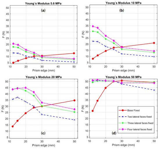 Figure 11. Chart depicting the reaction force F (N) produced by a 5 × 10−5 mm displacement of a rebar embedded in mortar prisms with different edges, different Young’s modulus and different boundary conditions: (a) Mortar with Young’s modulus of 5.6 GPa; (b) mortar with Young’s modulus of 10 GPa; (c) mortar with Young’s modulus of 20 GPa; (d) mortar with Young’s modulus of 50 GPa.