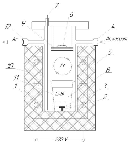 Liquid metals exhibit a number of properties, including high thermal and electric conductivity, fluidity, low volatility, and high boiling point, that make them attractive in various industrial applications, e.g., where efficient heat transfer is required. Low melting metals and their alloys with acceptable nuclear–physical characteristics (i.e., Li, Na, K, Pb, Bi) can be used as coolants in fast nuclear reactors [,], transport reactors for submarines [], and reactors for space applications []. In addition, liquid metals can be used for reprocessing spent nuclear fuels (SNF) and, currently, a wide range of studies of promising methods of SNF reprocessing using liquid metal media [] is under way.