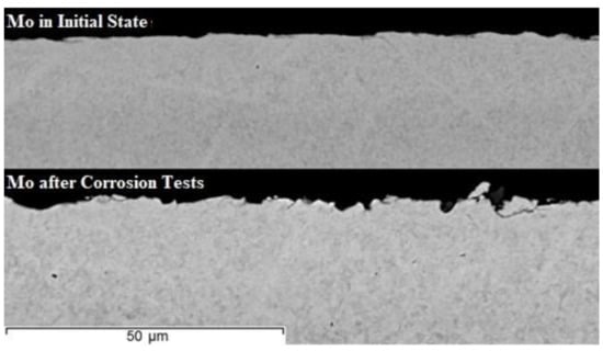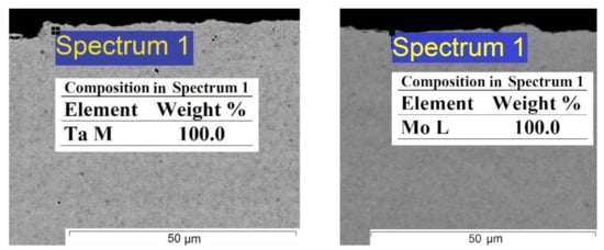 After contact with liquid BLA, samples of molybdenum and tantalum were examined by SEM to determine possible nature of the metals’ surface degradation (Figure 3). The results revealed no significant changes in the microstructure of metals; the surface was uniform with no significant damage. The bulk of the metals showed typical single-phase microstructure. The microstructure of the surface layer of the samples did not differ from the bulk. SEM–EDS analysis of the surface of molybdenum and tantalum samples showed that the elemental composition of the surface layer remained unchanged (Figure 4). No oxygen-containing phases—that can be formed if there was oxygen contamination in the atmosphere of the experimental cell—were detected on the surface. Lithium does not form intermetallic compounds with molybdenum or tantalum, and the solubility of these metals in lithium does not exceed 10−4 wt.% at 1000 °C [,,].
