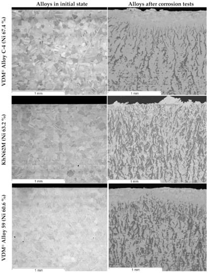 - Polovov, I.B.; Abramov, A.V.; Gibadullina, A.F.; Alimgulov, R.R.; Karpov, V.V.; Zhilyakov, A.Y.; Khotinov, V.A. The effect of microstructure on the corrosion resistance of VDM® alloy C-4 in molten salts. J. Alloys Compd. 2019, 810, 151758. [Google Scholar] [CrossRef]