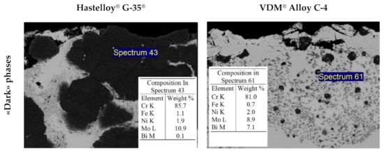 The corrosion rates of nickel alloys could not be estimated using the gravimetric method since a significant amount of bismuth remained on the surface and in the bulk of the alloy samples. The microstructure of nickel alloys before and after the corrosion tests is shown in Figure 5. Interaction with BLA resulted in significant changes in nickel alloy microstructure. Prior to the corrosion tests, the alloys exhibited a solid solution single-phase structure. After the corrosion tests different phases appeared in the bulk on the samples (Figure 5). On first glance, these phases can be considered as the signs of corrosion destruction or pitting. However, a more detailed investigation showed that these pitting marks were in fact separate phases formed as a result of the interaction of alloys with BLA. Examining the samples in the back-scattered electron (BSE) regime revealed “dark”, “gray”, and “light” phases. Examples of microstructure of alloys with minimal and maximal nickel content, i.e., VDM® Alloy C-4 (67.4 wt.% Ni) and Hastelloy® G-35® (57.2 wt.% Ni), are shown in Figure 6.