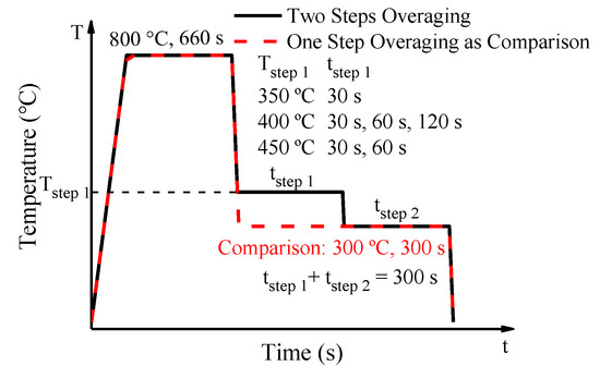 Figure 7 shows the mechanical properties of the different step 1 temperatures with the same time of 30 s. The YS is shown in Figure 7a, and the yield stress of different step 1 temperatures is disordered in specimens of 1.0 mm, 1.2 mm and 1.8 mm. For the specimens of 1.4 mm and 1.6 mm, the overaging processes can be divided into two groups according the mechanical properties. One group is one step overaging process at 300 °C, and another group is two steps overaging processes with different step 1 temperatures. The same classifies are also obvious in UTS and TE, which is shown in Figure 7b,c. For samples with step 1 time of 30 s, the properties of UTS and TE match the microstructure (Figure 5b,c,e) well. Less difference can be found in UTS and TE, and less difference can be seen in the microstructure.
