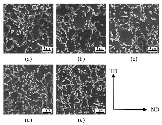 The microstructure of the specimens among different thicknesses overaging at 400 °C for 60 s (named as step 1) shows a great similarity as shown in Figure 4. All the specimens of this process consist of equiaxial ferrite matrix and island-like martensite (located at the ferrite boundary). Besides, some martensite islands are located inside the ferrite. The volume fraction of martensite is same for all thicknesses when considering the measuring error, and it was measured to be 30.5% ± 1.5% by Image J. The shape of martensite and the distribution of martensite are also similar for all thickness zones. This characteristic of similarity of martensite can be found among all processes. Thus the martensite volume fraction of all samples with different thicknesses and different overaging process is all around 30.5% with a similar shape and distribution.
