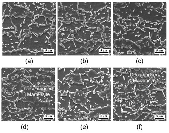 The microstructure of DP-TRB after different annealing processes is shown in Figure 5. The classical microstructure for one step overaging is shown in Figure 5a. And Figure 5b,c,e, which step 1 time of the specimens are all 30 s, show a similar microstructure. The difference in step 1 temperature doesn’t make an obvious difference in the microstructure, the microstructure of samples look like the one step overaging in Figure 5a. As shown in Figure 5d,f, retained austenite or partial martensite decomposes when the step 1 time getting longer. Figure 5d shows some incompletely decomposed structure, and the precipitation of carbide appears. In Figure 5f, some completely decomposed structure which is from retained austenite is shown, and the original shape of island is disappeared. Thus the temperature has more influence on microstructure than time, as specimens that hold temperature at 450 °C for 60 s have a greater degree of decomposition than specimens that hold at 400 °C for 120 s. The Ms calculated by Jmatpro is 350 °C, the C concentration used in calculation is the austenite equilibrium concentration at 800 °C, this temperature is same as the temperature of intercritical annealing. And other component content used in calculation is same as raw material. The step 1 temperature of 450 °C, 400 °C and 350 °C is above or near Ms, and located at the temperature range of bainite transformation. In this condition, some bainite generates in step 1, besides, some retained austenite at step 1 would decompose. The bainite transformation is a kind of semi-diffusion phase transformation, and the generated bainite plays a similar role as the decomposed martensite in C partition, and the decomposed austenite also shows the same characteristic. It means that the carbon will diffuse from bainite, martensite, and decomposed austenite into the ferrite. Besides, it’s difficult to distinguish bainite from martensite without an obvious substructure. In this paper, the bainite, martensite, and decomposed austenite play a similar role in microstructure and mechanical properties. Thus, they are all called the second phase.