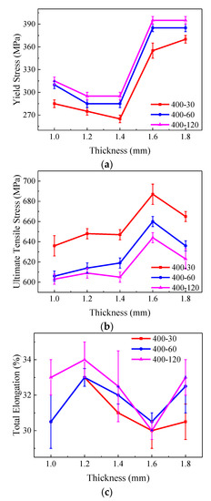 Figure 6 shows the mechanical properties of specimens which step 1 temperature is 400 °C. It’s obvious that the yield strength (YS) is different with the thicknesses. For the nearby thicknesses of 1.4 mm and 1.6 mm, the difference of yield stress is as large as~90 MPa. And the yield strength is improved as the time of step 1 increases. While the ultimate tensile strength (UTS) shows an opposed phenomenon. The total elongation (TE) shows little difference between the different time of step 1. The main factor for the difference of TE is thicknesses. The 1.2 mm specimen has the maximum TE and the 1.6 mm specimen has the minimum TE, while the specimens of 1.4 mm and 1.6 mm show minimum strength and greatest strength.