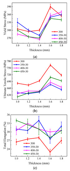 4.2. The Different Mechanical Properties among Thicknesses
