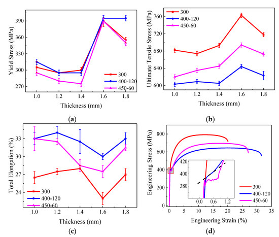 The mechanical properties for special processes: (a) yield stress, (b) ultimate tensile stress, (c) total elongation, (d) engineering stress-strain curve for 1.6 mm with different processes.