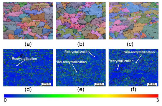 The BC + Euler map and the KAM map for process which step 1 is holding at 450 °C for 60 s: (a) BC map of 1.0 mm, (b) BC map of 1.6 mm, (c) BC map of 1.8 mm, (d) KAM map of 1.0 mm, (e) KAM map of 1.6 mm, (f) KAM map of 1.8 mm.