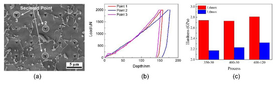 The hardness of different processes: (a) the schematic diagram of measured point; (b) the load curve of selected point in (a), (c) the average hardness of different processes.