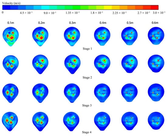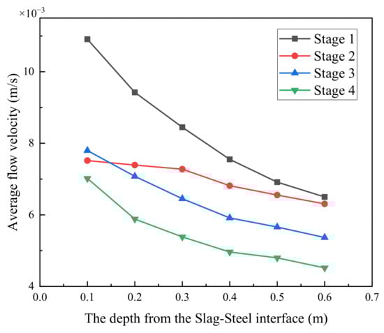 | Number of Smelting Stages | Average Flow Velocity of the Liquid Surface at the Corresponding Depth from the Slag–Steel Interface (×10−3 m/s) | Average value (×10−3 m/s) | |||||