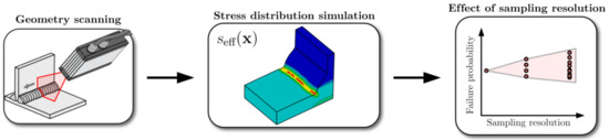 Although the aforementioned studies include the measured geometry of welded joints in detailed FE simulations, they lack the ability to identify the level of detail that is required for a proper fatigue assessment. In the current study, the sampling resolution is investigated for digitalized weld quality assurance systems which is required to accurately predict the fatigue performance. Based on the scanned topographies, a probabilistic weakest-link approach [28,29,30] is proposed. This work therefore provides the following scientific contribution.