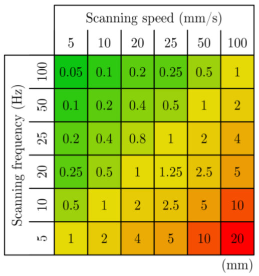Sampling resolution (mm) for different combinations of scanning speeds (mm/s) and sampling frequencies (Hz).