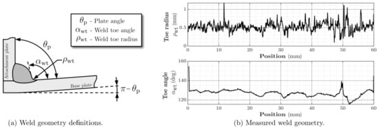 The captured weld geometry is analysed using the commercial quality assurance system Winteria ® qWeld (Winteria, Hudiksvall, Sweden) [32]. This is done to investigate and present the scatter in weld geometry for the investigated group of specimens independently from the simulations that is later carried out. This quality assurance system quantifies the weld geometry into geometric definitions as throat thickness, weld leg length, undercut, weld toe radius and weld toe angle using internal algorithms developed by Stenberg et al. [5,6]. The algorithm goes through each weld section with an internal algorithm which locates the weld toes and determines the weld toe radii and angle by a fitting routine. The accuracy of the method has been proven to be comparable to other commercial programs when the same reference block has been studied [5]. The accuracy has also been studied in [6]. The latter two geometrical parameters are presented in Figure 4 along the weld surface of specimen 24.