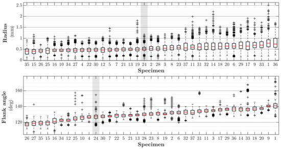 The variation in radius and weld toe angle between the tested specimens is presented in Figure 5. The scatter of the mean weld toe radius between the specimens is less than 0.5 mm and the corresponding scatter for the weld toe angle is approximately 20 degrees. The mean value of the weld toe radius for the investigated specimens is 0.56 mm with a standard deviation of 0.21 mm for the group. There are some specimens where outliers with smaller radii are visible, which potentially indicates the presence of local regions where high stress concentrations can be expected. One of these is the previously mentioned specimen 24 where a sharp corner can be seen at the 50 mm position. This specimen is of interest as its mean values for both presented parameters are representative for the group of specimens, while it has a large number of outliers below the mean for both parameters.