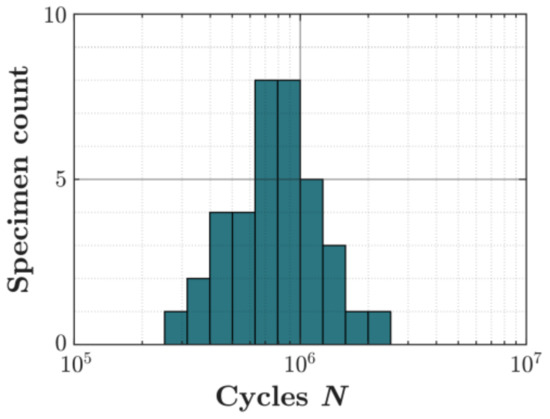 Constant amplitude fatigue testing was carried out using an MTS High-Force Servo hydraulic tensile tester (MTS, Eden Prairie, MN, USA) at a load ratio of 0.1. All specimens were tested at a load level of 180 MPa. A total of 51 specimens were tested, and 14 of those were stopped at 5 million cycles as no failure had occurred. The test results for the failed specimens are presented both in Figure 6 and Table 1. Only the specimens that failed are processed further in this study.