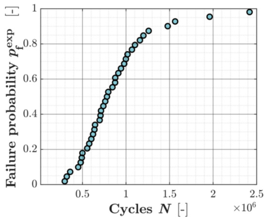 The experimental failure probability was determined for the 37 specimens that failed using an approximation for median ranks proposed by A. Benard [33],