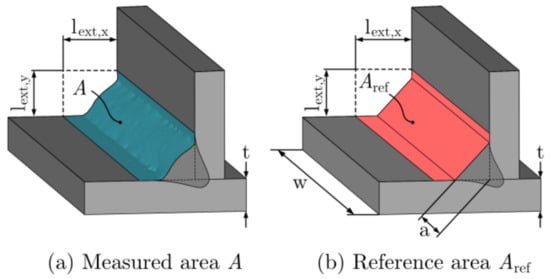 The reference area, , is taken as the local area of the idealised weld surface. This is idealised as the throat area of the weld bead with two extension regions at both weld toes with lengths and , as seen in Figure 8 and Table 2. It is possible to use either the measured mean value of the throat thickness for the group of specimens or the desired throat thickness, as the fitting procedure will account for any deviation between the two. The latter one is used in the present study. The distances of the extension regions are chosen so that all stress-raising effects near the weld toes are included in . The idealised weld surface is not influenced by the measured geometry of individual specimens. The reference area must be large enough to accurately capture the stress distribution in the weld and the highly stressed region near the load-carrying weld toe for all investigated specimens. This needs to be fulfilled even for the most extreme variations in the local weld geometry seen in the group of specimens. The reference area is also chosen so it is smaller than the total area measured by the laser scanner, as this ensures that no extrapolation in the dataset is needed. The reference area is calculated as