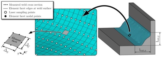 Given the scanned weld geometry obtained from the digitalized measurement system, the influence of local topographical variability can be assessed [9,10]. For this purpose, simulation approaches based on finite element (FE) analysis of the weld are predominantly used. Lang R. et al. [11,12,13], as well as Lener et al. [14], presented a framework for scanning and simulation of the weld geometry using a statistical approach and a Weakest-link fatigue model. It is noted that the influence of local surface defects is phenomenologically included in the Weakest-link model [15]. Niederwanger et al. [16] presented a comprehensive study where different fatigue modelling concepts were compared with regard to both idealised and measured weld geometry, captured using laser scanning. Kaffenberger and Vormwald [17,18] proposed modelling recommendations for idealized weld geometry simulations, based on the notch stress concept and 3D scanning of overlap and tee joints. Hou [19,20] and Chaudhuri et al. [21] modelled the measured 3D weld geometry to predict experimentally observed beachmark locations and crack measurements, respectively, based on weld toe stress concentration factors (SCF). Aldén et al. [22] performed detailed 3D simulations on cruciform joints of different weld classes showing that, while the maximum von Mises stress gives a good indication on the fatigue failure initiation location, it gives ambiguous predictions of the fatigue strength. Liinalampi et al. [23] investigated the fatigue strength of laser-hybrid welded fully penetrated butt joints based on 2D simulations of the measured weld geometry, captured using both stereo camera measurements as well as 3D laser microscopy. Ladinek et al. [24,25] studied the influence of measured weld geometry on fatigue life using a strain-life concept and Lang E. et al. [26,27] found that numerical simulations of the measured 3D geometry reproduce the experimental strain data for butt joints in the low cycle fatigue regime.