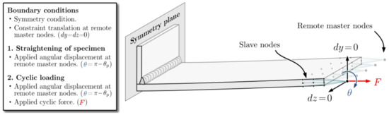 Half of the specimen, including the non-treated weld, is modelled as a representative unit of fatigue strength for the complete specimen. This is motivated by the fact that no fatigue failure was initiated at the HFMI-treated weld. A symmetry boundary condition is applied on the symmetry plane going through the middle of the stiffener. The nodes located at the far end of the specimen, where the fatigue clamps grip, are slave nodes connected rigidly to remote master nodes that lie in corresponding z-planes, as schematically presented in Figure 10. These nodes are constraints from translation in all directions except for in the x-direction and they are only free to rotate around z.