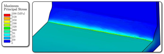 Each specimen is simulated in two analysis steps—the first step represents the straightening of the specimen in the clamping phase (prescribed rotation θ = π − θp) and the second corresponds to the cyclic loading of the specimen (prescribed rotation θ = π − θp and applied nominal force F). Linear elastic material behaviour is implemented in the simulation model with a Young’s modulus of 200 GPa and a Poisson’s ratio of 0.3. The stress distribution for specimen 24 under cyclic loading is presented in Figure 11. The implemented simulation process is completely automated from start to finish to ensure that all specimens are analysed using the same conditions. The only manual input needed during the process is the location of the fatigue critical weld toe in the scanning data. The CPU (Intel(R) Core(TM) i9-10940X (14Core, 3.30GHz)/64GB RAM) simulation time for each specimen is around 1 h per specimen.