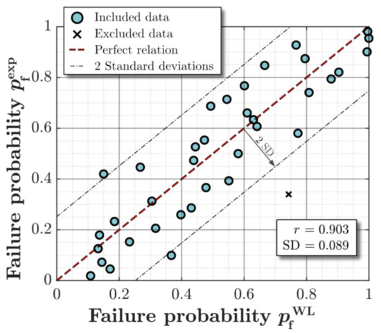The parameters that minimised the are presented in Table 2. One specimen was excluded from the fitting process as it singly influenced the fitted parameters and increased the MSE more than any other specimen. The same specimen after the fitting was verified as an outlier as it was more than 1.5 times the interquartile range [42] away from the upper quartile or below the lower quartile of the relative error in estimated failure probability