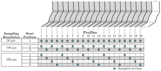 Consider the weld geometry of the specimen shown in Figure 12, which is scanned using a high resolution of 50 μm. The geometry of the specimen is resampled with lower sampling resolutions and different sampling sequences, as schematically shown in Figure 13. As can be seen, each sampling sequence corresponds to a different scanning start position. By taking every other weld profile into consideration, the sampling resolution is decreased to 100 μm with two possible starting positions. Decreasing the sampling resolution further to every fourth weld profile decreases the resolution to 200 μm with four possible starting positions. It is noted that that the highest sampling resolution of 50 μm corresponds to 1200 weld profiles for the studied 60 mm long weld.