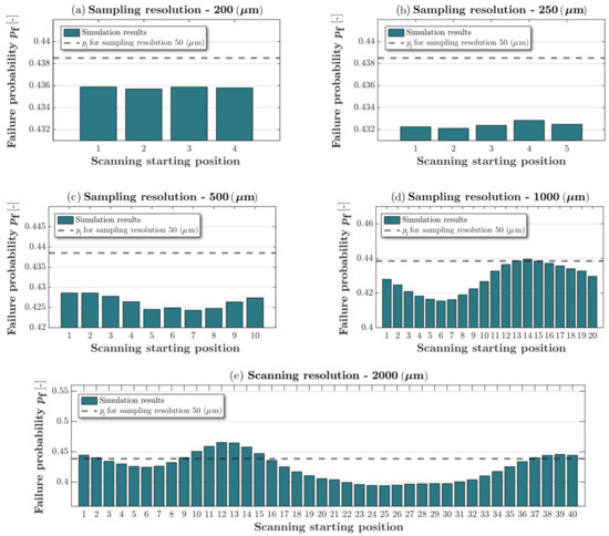 Influence of starting position on the model failure probability at different sampling resolutions. (a) 200 μm sampling resolution, (b) 250 μm sampling resolution, (c) 500 μm sampling resolution, (d) 1000 μm sampling resolution, (e) 2000 μm sampling resolution.